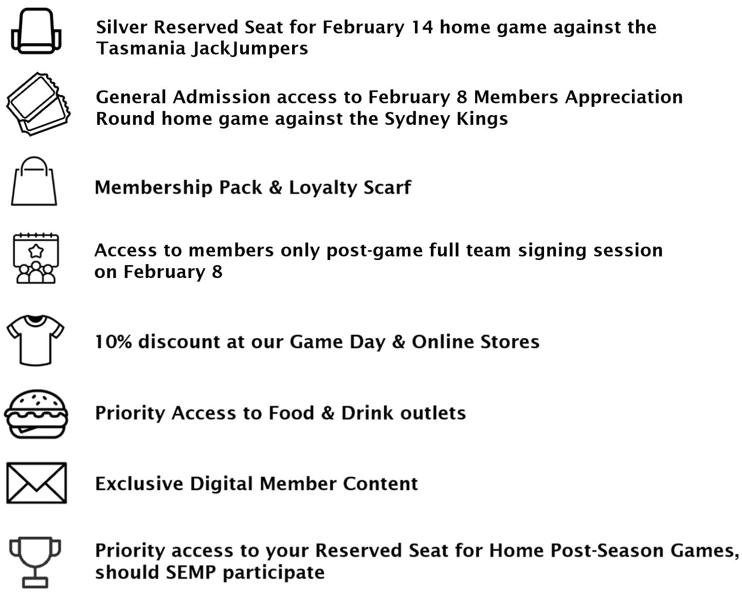 Enjoy a Silver Reserved seat for our February 14 home clash against Tasmania, plus General Admission access to our February 8 Member Appreciation Round, including a members only post-game full team signing session.